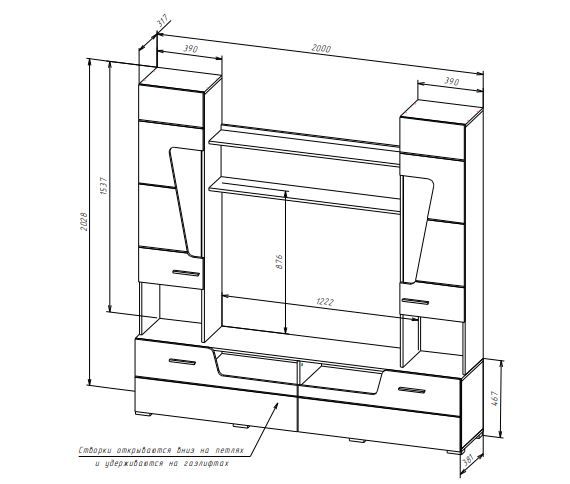 - Тумба напольная имеет две откидные створки на газлифтах (секретерных), Два открытых проема под технику (593х154х362мм) (Размер - Тумбы напольной 2000х491х381мм)