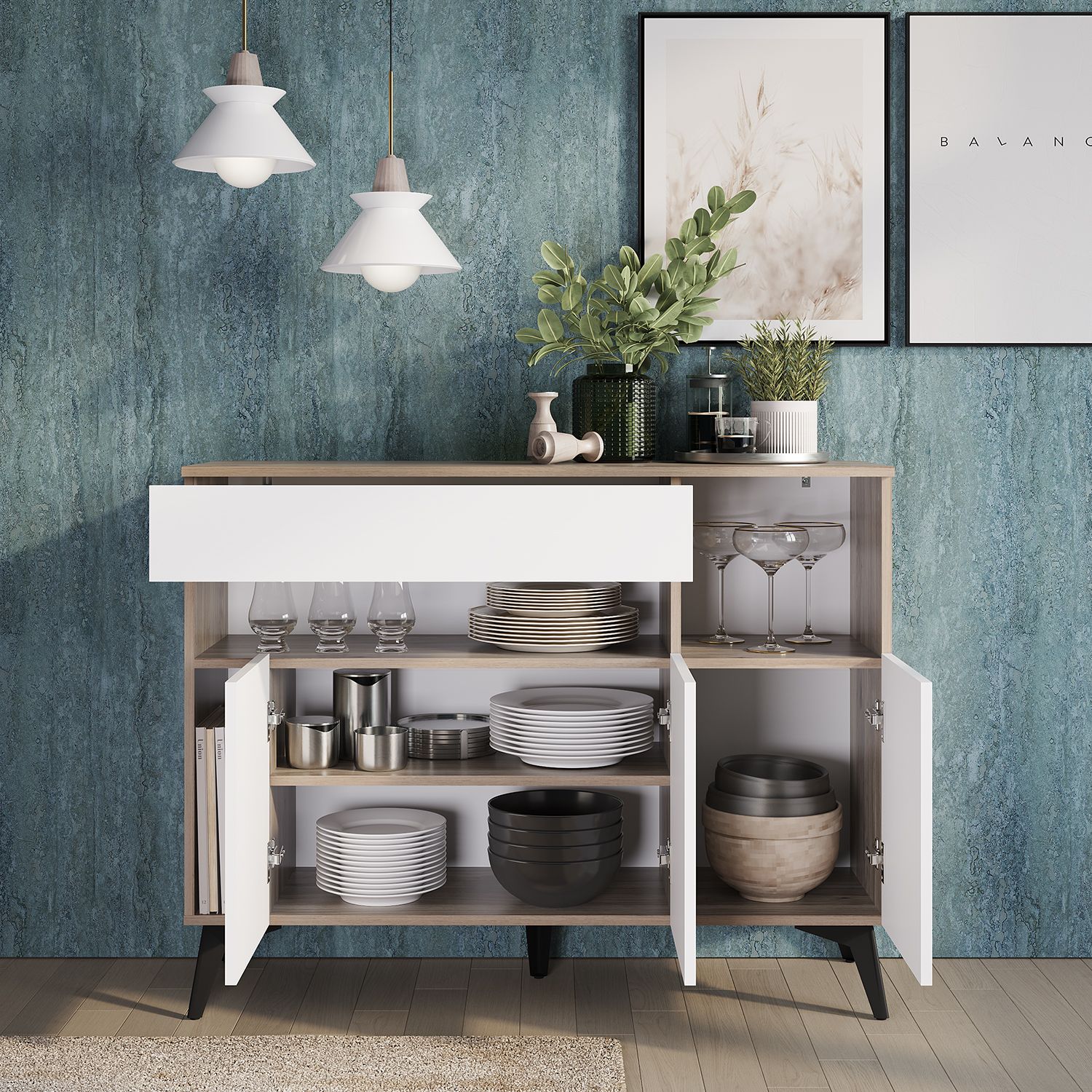 Отсутствие лицевой фурнитуры, удлиненные фасады (открывание за край створки или фасада). Удобный ящик с направляющими полного выдвижения. Стильные черные металлические ножки.