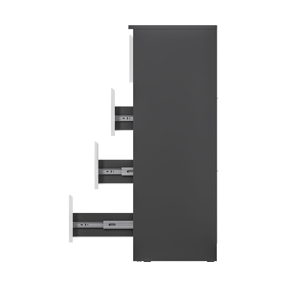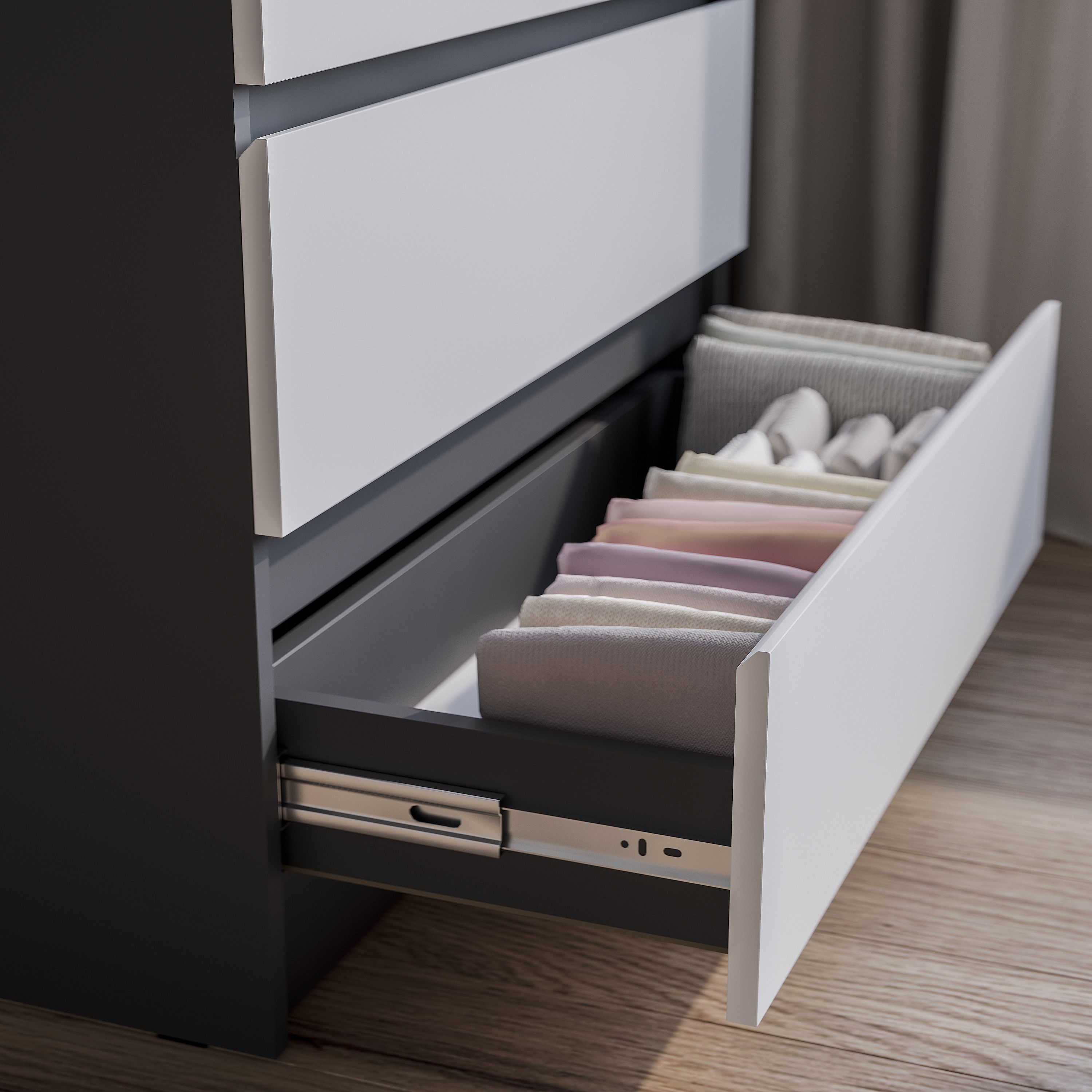 Гладкие фасады (без фурнитуры) и плавные шариковые направлящие. Кромка - 0,45 мм. Крепление к стене - уголок овербаланс. Максимальная нагрузка на ящик - 5 кг.