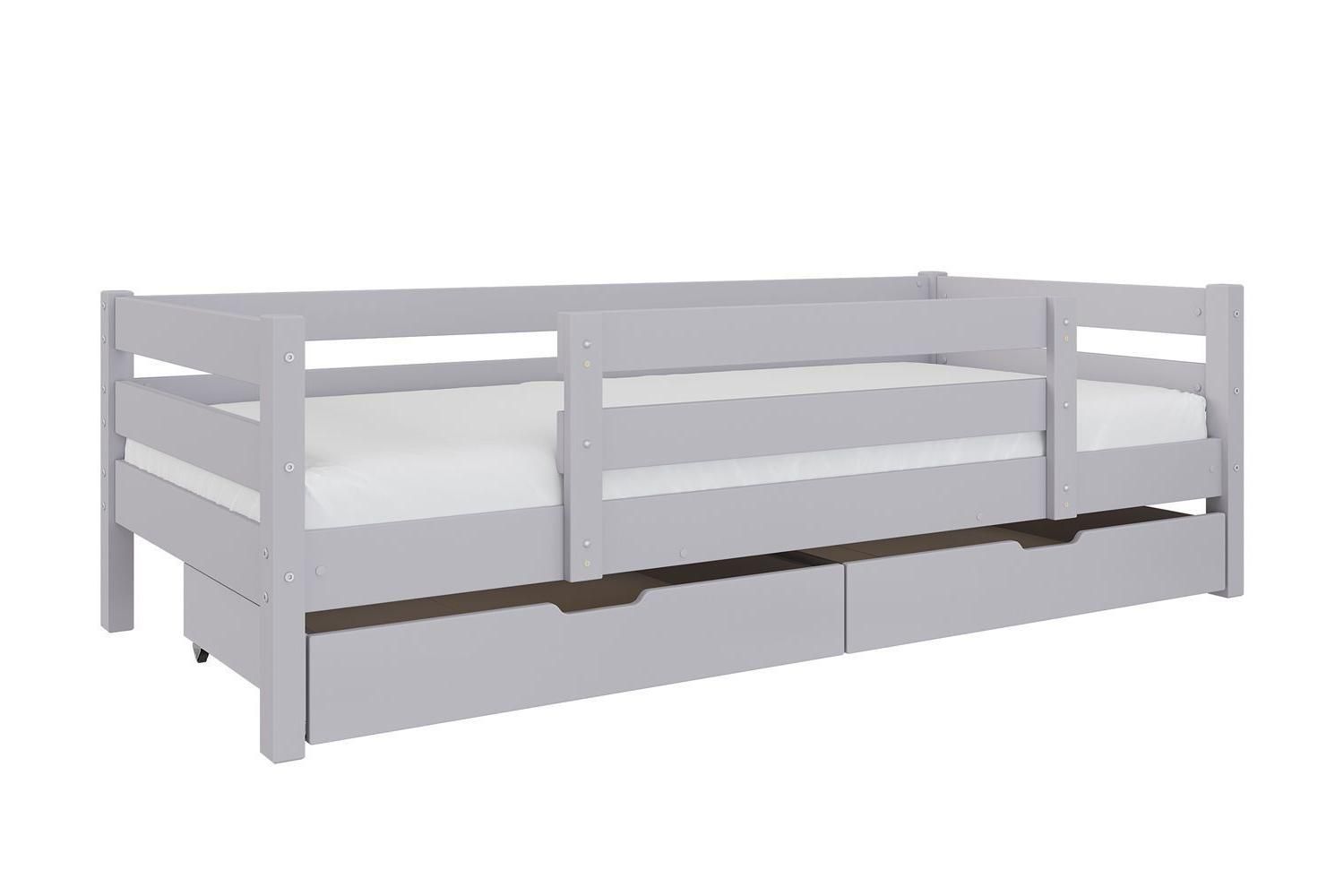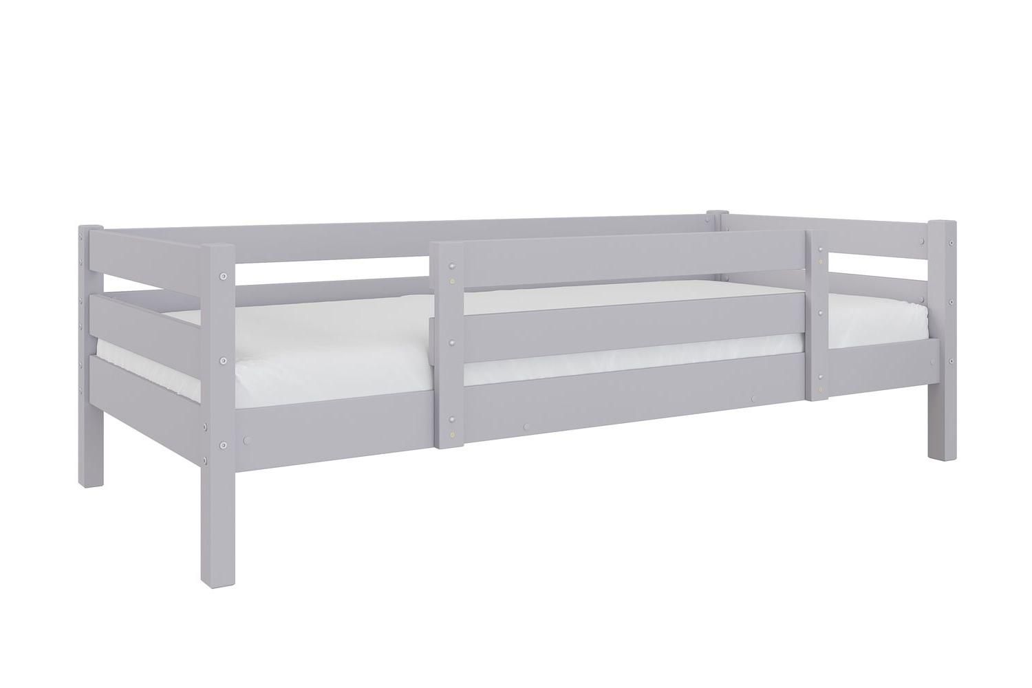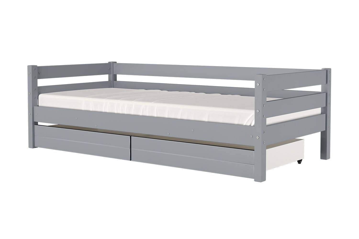 Кровать выполнена из массива сосны, покрыта лаком в цвете антрацит.