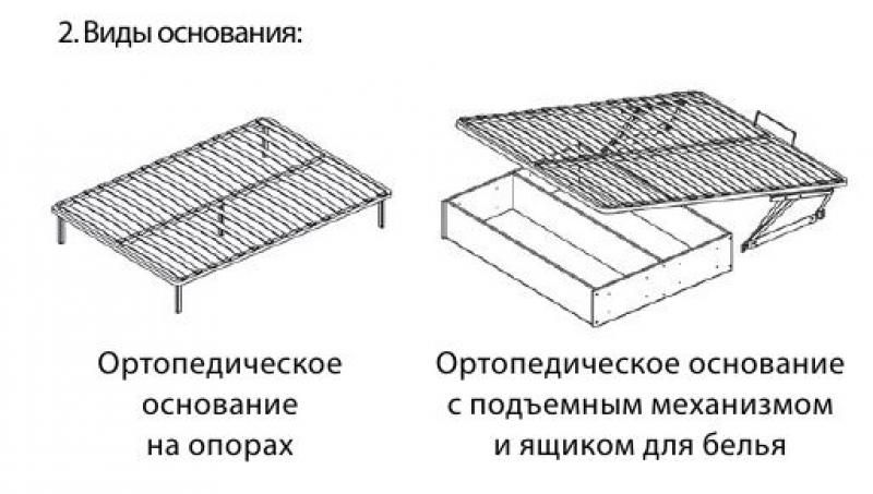 Основание кровати - ортопедическое с подъемным механизмом и ящиком для хранения в комплекте.