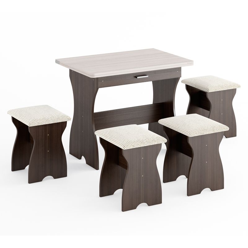 Состоит из прямоугольного стола с ящиком, который можно разложить по необходимости,и четырёх табуреток ,