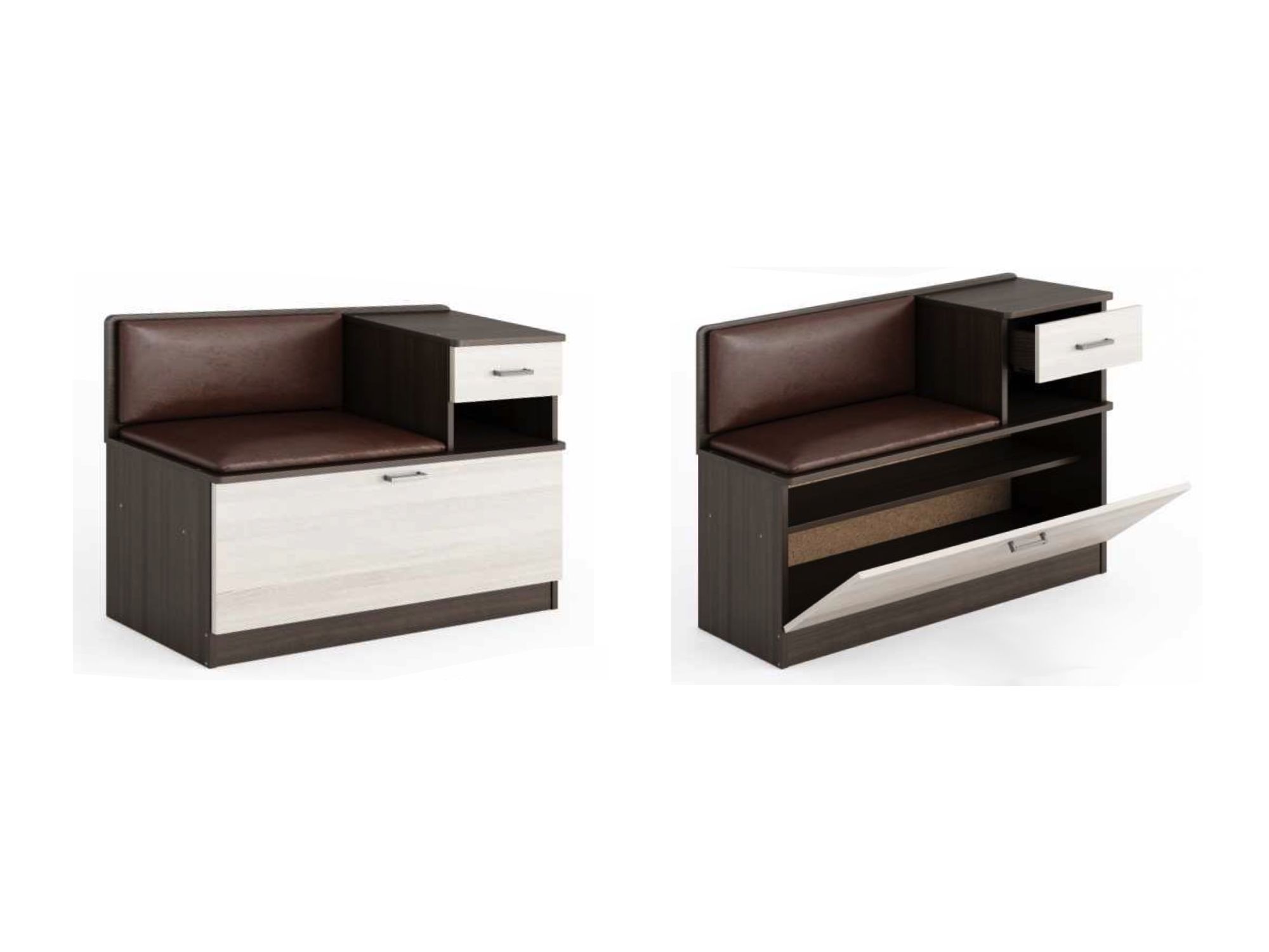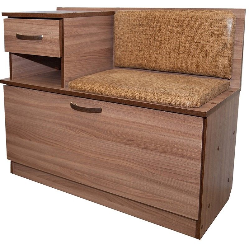 Сиденье кожзам или ткань рогожка на выбор ( слева или справа), отделение под обувь разделено пополам до середины глубины , удобно как для обычных кроссовок так и для высоких сапог, ящик для хранения средств по уходу за обувью и вских мелких вещей .