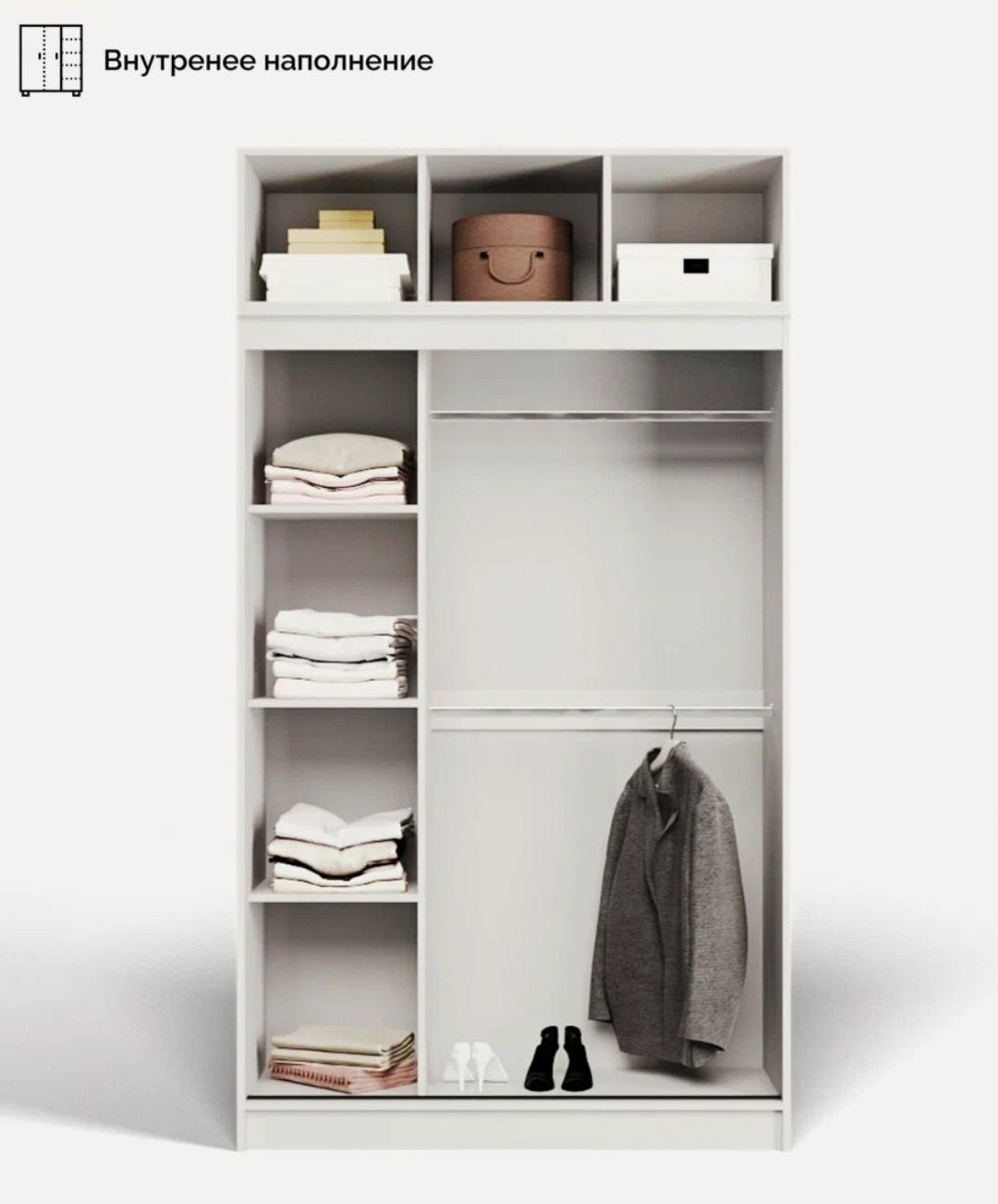Наполнение шкафа: Антресоль, полки для белья, 2 горизонтальные штанги.